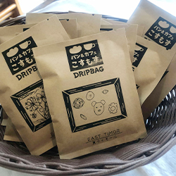 大阪府枚方市にあるコーヒー焙煎ワーカズ珈琲工房「まめ福」から取り寄せたフェアトレードコーヒー豆を挽いてこすもすオリジナルのドリップコーヒーを作りました。