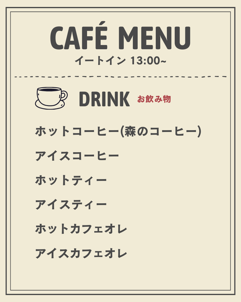 13時から店内でイートインができます。パンと一緒にコーヒーや紅茶はいかがですか。