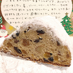 毎年、クリスマスシーズンにむけシュトレンを作っています。こすもすのシュトーレンはこだわりの材料を使って、心を込めて丁寧につくっています。
